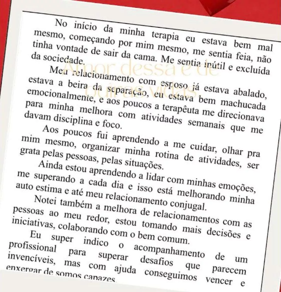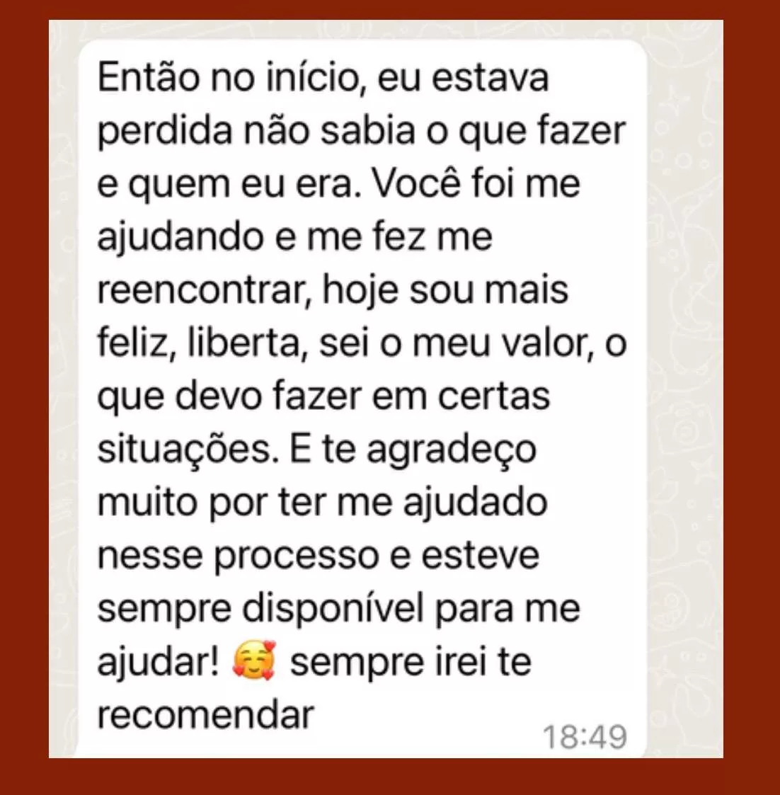 Você vai falar sobre os seus conflitos e dores, tirar suas dúvidas e receber informações de como proceder a cada passo a passo diário;