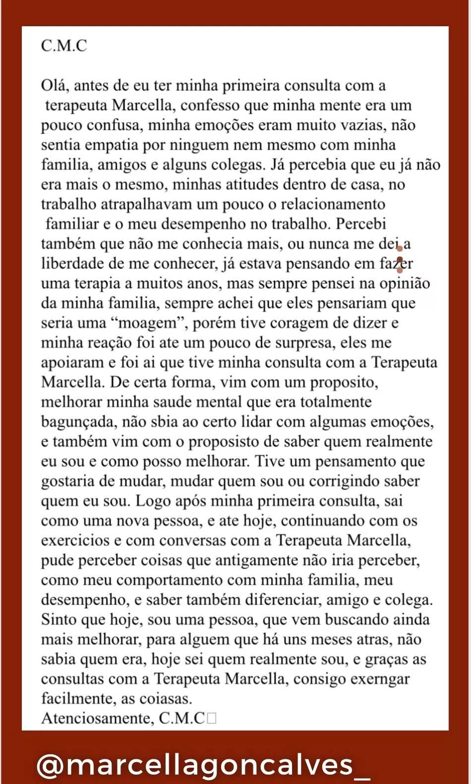 Vou estar com você nas Lives com tema que vai ajudar você. Vídeos no Canal You Tube Marcella Gonçalves.terapeuta que vão abordar sobre assuntos do Coração Partido, vão ajudar a compreender melhor você e o seu relacionamento.